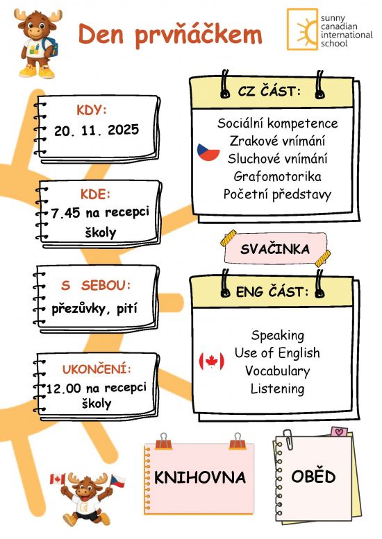 Vaše dítě usedne do lavice, prožije dopoledne v báječné atmosféře naší školy, potká se s kamarády a našimi českými i anglickými učiteli.